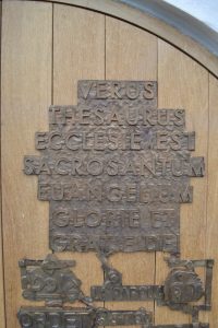 Den ny kirkedør med bronze-relieffer af billedhuggeren, professor Hein Heinsen er nu på plads i Hørve Kirke: “Kirkens sande skat er det hellige evangelium om Guds herlighed og nåde” står på dansk på venstre fløjdør og på latin på den højre. Under disse er “Ordet” gengivet på flere sprog: digitalt, græsk, japansk, tysk m.fl.